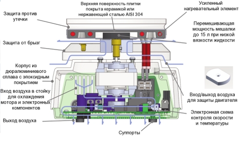Общие характеристики: Цифровое управление. Уникальный дизайн корпуса из алюминиевого сплава с эпоксидным покрытием; нагревательная плитка 0,145 мм окружена защитным кольцом, препятствующий попаданию разлившейся жидкости в основной блок из нерж. стали AISI 304. Термостойкая прокладка с экраном из нержавеющей стали изолирует ручки настройки от нагревательной плитки. Верхняя панель из нержавеющей стали легко снимается. Передняя панель расположена под углом и ограждена бортиками для лучшего обзора и защиты от брызг и разлившейся жидкости. Дополнительно можно заказать стойку для посуды, которая закрепляется в специальном гнезде. Электронный регулятор скорости (от 60 до 1600 об/мин, обеспечивает ее постоянство независимо от вязкости жидкости. Прибор прост в эксплуатации, легко разбирается. Имеет устройство аварийного отключения при перегреве. Круглая форма гарантирует оптимальное распределение тепла.