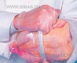 Стерильный пакет запаян сверху и имеет перфорацию по линии вскрытия. Вмещает небольшие тушки индейки, курицы и другой птицы подобного размера.