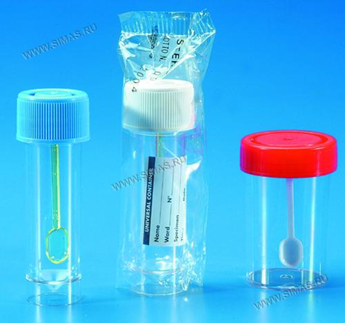 Контейнер с завинчивающейся крышкой и ложечкой, объемом 30 и 60 мл. Поставляются также стерилизованные изделия.