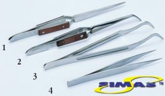 Рис. 1. Пружинящий прямой пинцет с концами из электрополированной нерж. стали AISI 304, боковые поверхности отделаны ДСП. Общая длина 160 мм. Рис. 2. Пружинящий прямой пинцет с изогнутыми концами из электрополированной нерж. стали AISI 304, боковые поверхности отделаны ДСП. Общая длина 160 мм. Рис. 3. Изогнутый пинцет с концами из электрополированной нерж. стали AISI 304. Общая длина 160 мм. Рис. 4. Тонкий пинцет с концами из электрополированной нерж. стали AISI 304. Общая длина 120 мм.