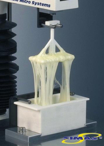 Анализатор текстуры вытягивает вилку вверх через расплавленный сыр, измеряя его тягучесть и сопротивление растяжению. Сопротивление и тягучесть сыра являются важными свойствами текстуры для многих изделий, прежде всего, пиццы.