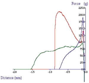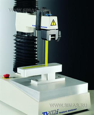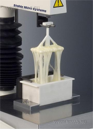Анализатор текстуры вытягивает вилку вверх, измеряя тягучесть и сопротивление растяжению. Сопротивление и тягучесть являются важными свойствами текстуры.