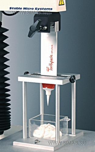 Описание: Это насадка для выдавливания содержимого пакетов или тюбиков, предназначенная для испытания фармацевтической, косметической продукции и средств для ухода, например, мазей, кремов и гелей, на легкость извлечения из упаковки. Продукт располагается в насадке вертикально между двумя роликами и зажимается с закрытого конца зажимом. Затем пакет/тюбик протягивается вверх через ролики, выдавливающие содержимое, при этом измеряется затрачиваемая на это сила.