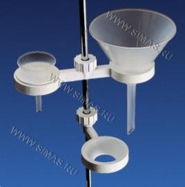 Держатель в форме подковы, разработанный специально для воронок, снабжен двумя коническими переходниками, позволяющими устанавливать на стержень изделия диаметром от 8 до 14 мм. Не пригоден для использования с воронками, диаметр которых меньше 75 мм.