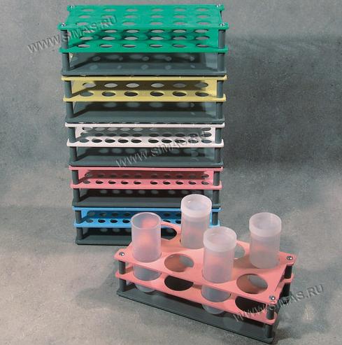 Штативы большой вместимости, стерилизуются автоклавом при температуре до +121°C в течение 20 минут. Могут использоваться в обычных условиях, а также установленными на паровую баню – не всплывают; форма изделий не создает препятствий для циркуляции жидкости и установления одинаковой температуры во всей пробирке. Пребывание штативов в морозильной камере не делает их ломкими и не приводит к деформации. Не ржавеют и не деформируются. Табличка с буквенно-цифровыми обозначениями, установленная на верхнем ярусе, облегчает работу с образцами. Для исключения возможных ошибок при работе с разными партиями образцов, присланными в лабораторию, используются цветовые обозначения. Пустые штативы могут устанавливаться друг на друга для освобождения пространства и с целью поддержания порядка на рабочем месте. Предусмотрен выпуск следующих цветов: белый, синий, желтый, красный.