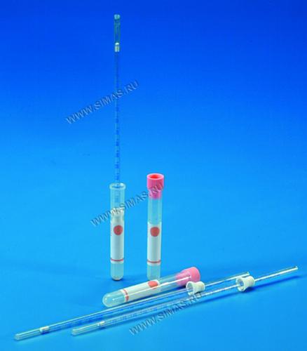 Пипетка из полистирола с градуировкой от 0 до 180 мм, нанесенной трафаретной печатью, снабжена волокнистой пробкой, уровню которой соответствует отметка 0, и небольшим поршнем для заполнения пипетки за счет повышения давления внутри нее.