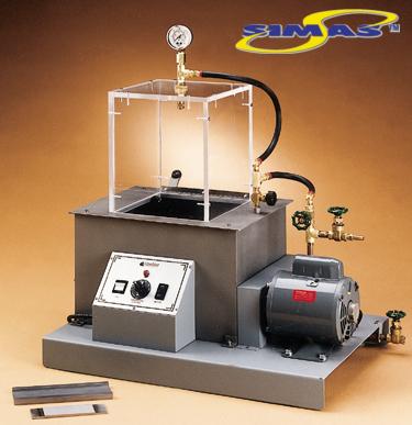 Смазанный шариковый подшипник вращается со скоростью 600 об/мин и подвергается воздействию струи воды при заданной температуре и расходе воды. Аппарат состоит из резервуара, корпуса подшипника, циркуляционной системы и электропривода. Резервуар оборудован вставным нагревателем, терморегулятором, и портом термометра для точного поддержания температуры. Циркуляционная система включает карбоновый шестеренный насос постоянной скорости, клапаны и расходомер, обеспечивающие направленный контролируемый поток воды в капилляр (1 мм) с форсункой, направленной в корпус подшипника. Электропривод мощностью 1/3 л.с. вращает подшипник со скоростью 600 об/мин, одновременно приводя в движение циркуляционный насос. Система с двумя шкивами, пока она прогревается до температуры испытания, позволяет независимо работать насосу для циркуляции воды.